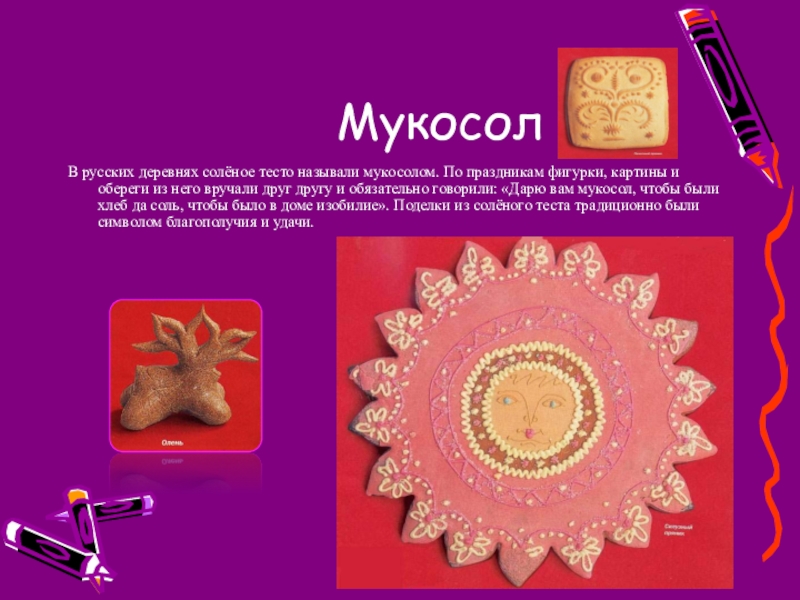 На Русском Севере, в хлебосольных и приветливых поморских домах на видных местах всегда стояли рукотворные диковины в виде маленьких фигурок людей и животных Это мукосольки – поделки из