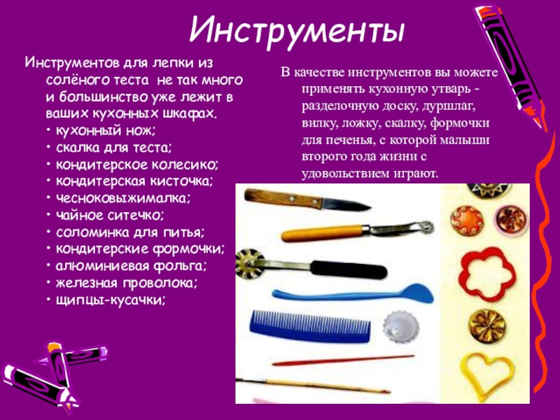 В качестве инструментов вы можете применять кухонную утварь -разделочную доску, дуршлаг, вилку, ложку, скалку, формочки для печенья, с которой малыши второго года жизни с удовольствием играют.