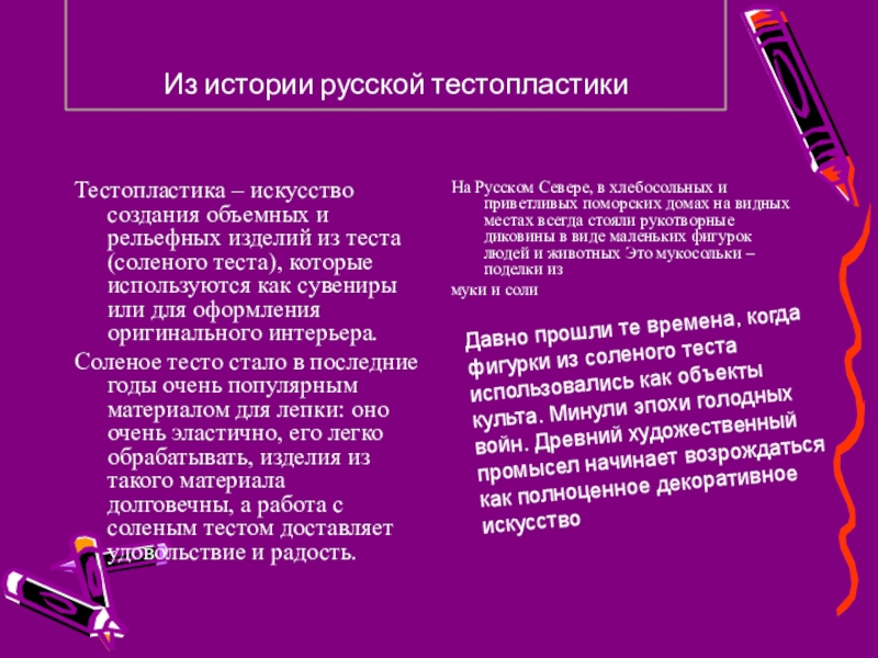 Неизвестно кому первому пришла в голову идея слепить из теста что-либо несъедобное, скорее всего ребенку - озорнику, вылепившему смешную хлебную зверюшку за обедом... Было это очень давно, люди начали лепить из теста не только хлеб, но и декоративные изделия.