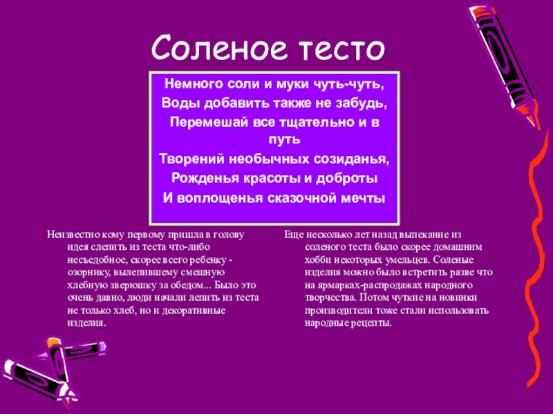 Еще несколько лет назад выпекание из соленого теста было скорее домашним хобби некоторых умельцев. Соленые изделия можно было встретить разве что на ярмарках-распродажах народного творчества. Потом чуткие на новинки производители тоже стали использовать народные рецепты.