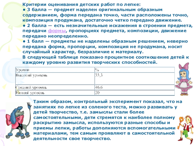 Таким образом, контрольный эксперимент показал, что на занятиях по лепке из соленого теста, можно развивать у детей творчество, т.е. замыслы стали более самостоятельными, дети стремятся к наиболее полному раскрытию замысла, используются разные способы и приемы лепки, работы дополняются вспомогательными материалами, тем самым проявляют в самостоятельной деятельности свое творчество.