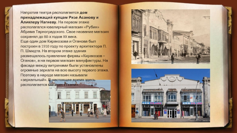 Слайд 13Напротив театра располагается дом принадлежащий купцам Ризе Асанову и Аликперу Нагиеву.