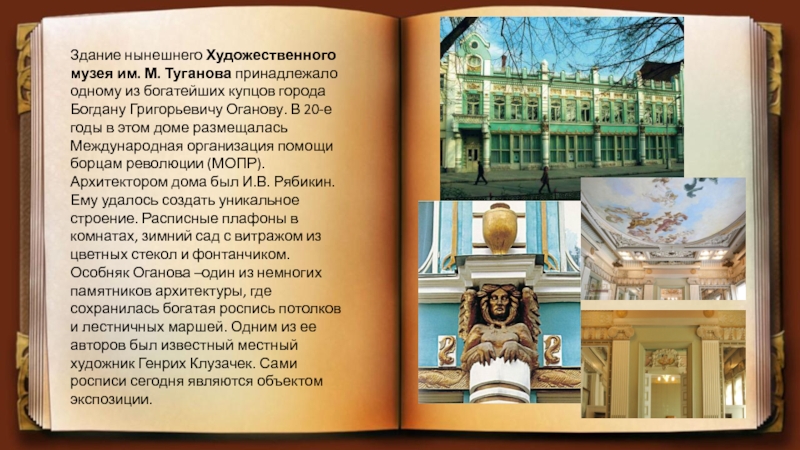 купцов города Богдану Григорьевичу Оганову. В 20-е годы в этом доме размещалась Международная организация помощи борцам революции (МОПР). Архитектором дома был И.В. Рябикин. Ему удалось создать уникальное строение. Расписные плафоны в комнатах, зимний сад с витражом из цветных стекол и фонтанчиком. Особняк Оганова –один из немногих памятников архитектуры, где сохранилась богатая роспись потолков и лестничных маршей. Одним из ее авторов был известный местный художник Генрих Клузачек. Сами росписи сегодня являются объектом экспозиции.