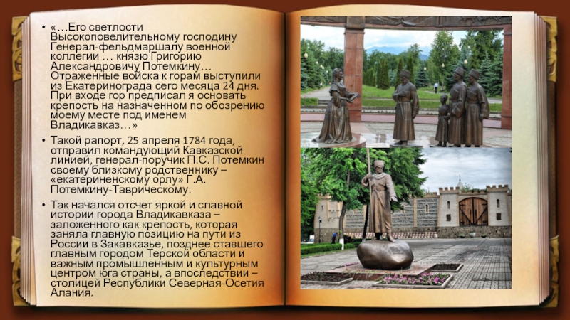 Потемкину… Отраженные войска к горам выступили из Екатеринограда сего месяца 24 дня. При входе гор предписал я основать крепость на назначенном по обозрению моему месте под именем Владикавказ…»