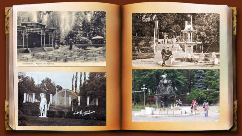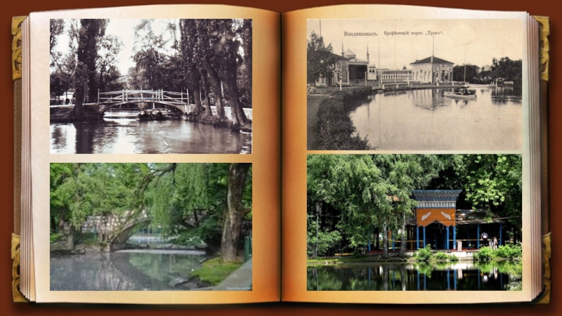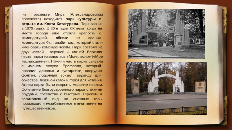 Коста Хетагурова. Парк возник в 1870 годах. В 30-е годы XIX века, когда на месте города еще стояла крепость с комендатурой, вблизи от здания комендатуры был разбит сад, который стали именовать комендантским. Парк состоял из двух частей – верхней и нижней. Верхняя часть парка называлась «Монплезир» («Мое наслаждение»). Нижняя часть парка связана с именем есаула Ерофеева, который посадил деревья и кустарники, соорудил фонтан, лодочный вокзал, веранду для оркестра, ледяной каток и горки для катания. Аллеи парка были покрыты морским песком. Сочетание благоустроенного парка с тихими прудами, соседство с быстрым Тереком и великолепный вид на снежные горы производили незабываемое впечатление на путешественников.