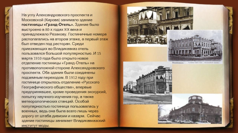 Здание было выстроено в 80-х годах XIX века и принадлежало Резакову. Гостиничные номера располагались на втором этаже, а первый этаж был отведен под ресторан. Среди приезжающих во Владикавказ отель пользовался большой популярностью. И 15 марта 1910 года было открыто новое отделение гостиницы «Гранд-Отель» на противоположной стороне Александровского проспекта. Оба здания были соединены подземным переходом. В 1912 году при гостинице открылось отделение «Русского Географического общества», впервые предпринявшее, кроме проведения экскурсий, попытку научного изучения гор, а также метеорологических станций. Особой популярностью гостиница пользовалась у военных, ведь она была всего лишь через дорогу от штаба дивизии и казарм. Сейчас здание гостиницы занимает Владикавказский институт моды.