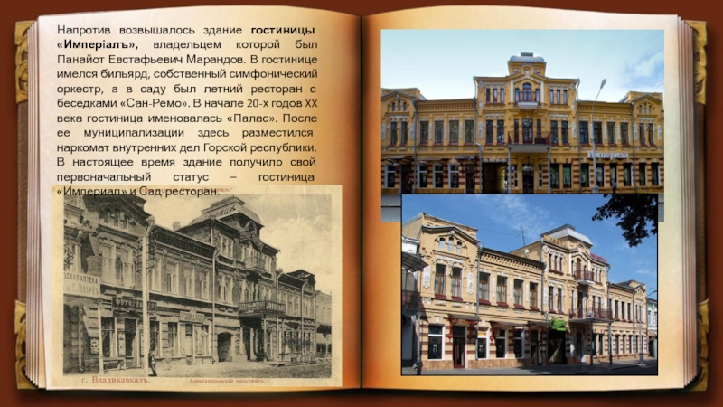 В гостинице имелся бильярд, собственный симфонический оркестр, а в саду был летний ресторан с беседками «Сан-Ремо». В начале 20-х годов XX века гостиница именовалась «Палас». После ее муниципализации здесь разместился наркомат внутренних дел Горской республики. В настоящее время здание получило свой первоначальный статус – гостиница «Империал» и Сад-ресторан.