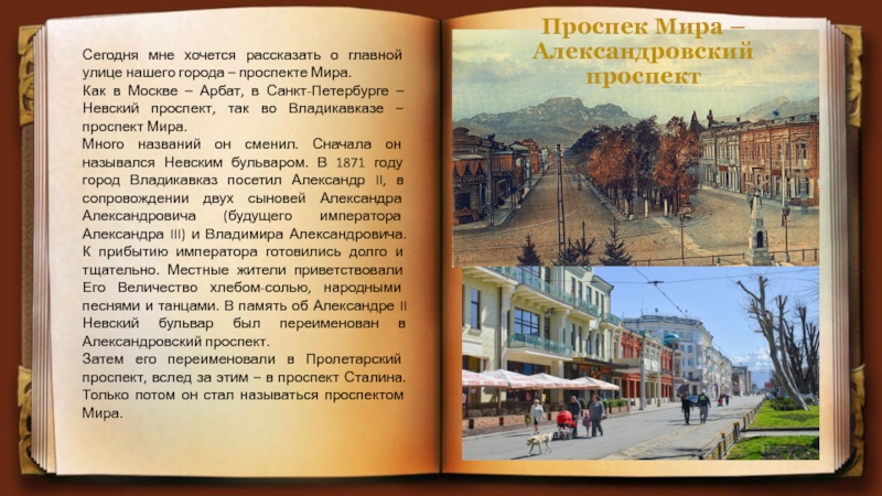 Это малая часть из того, что можно рассказать о проспекте Мира протяженностью в 1157 шагов, он является показателем всех самых значительных перемен в жизни Владикавказа, остается любимым местом отдыха горожан и гостей столицы республики. Давно ушли в небытие бывшие сильные мира сего Киракозовы, Огановы, Алиевы, Яраловы, Ладыженские, Ходяковы… А их творения в камне до сих пор служат людям. Как ни рос и развивался Владикавказ, Александровский проспект всегда будет его главной улицей.