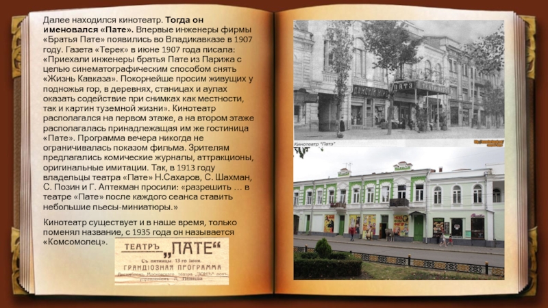 Слайд 9Далее находился кинотеатр. Тогда он именовался «Пате». Впервые инженеры фирмы «Братья