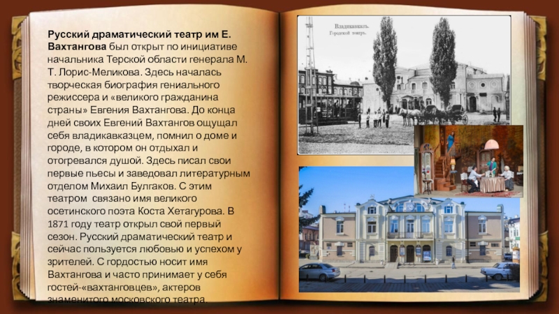 Терской области генерала М.Т. Лорис-Меликова. Здесь началась творческая биография гениального режиссера и «великого гражданина страны» Евгения Вахтангова. До конца дней своих Евгений Вахтангов ощущал себя владикавказцем, помнил о доме и городе, в котором он отдыхал и отогревался душой. Здесь писал свои первые пьесы и заведовал литературным отделом Михаил Булгаков. С этим театром связано имя великого осетинского поэта Коста Хетагурова. В 1871 году театр открыл свой первый сезон. Русский драматический театр и сейчас пользуется любовью и успехом у зрителей. С гордостью носит имя Вахтангова и часто принимает у себя гостей-«вахтанговцев», актеров знаменитого московского театра.