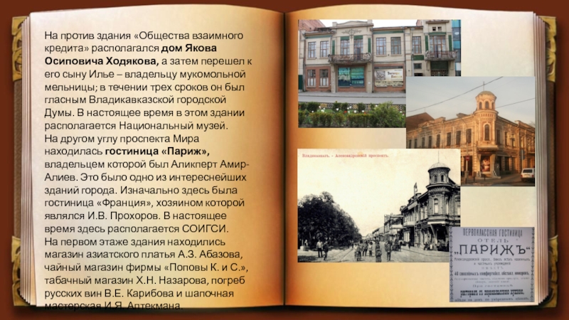 На другом углу проспекта Мира находилась гостиница «Париж», владельцем которой был Аликперт Амир-Алиев. Это было одно из интереснейших зданий города. Изначально здесь была гостиница «Франция», хозяином которой являлся И.В. Прохоров. В настоящее время здесь располагается СОИГСИ.