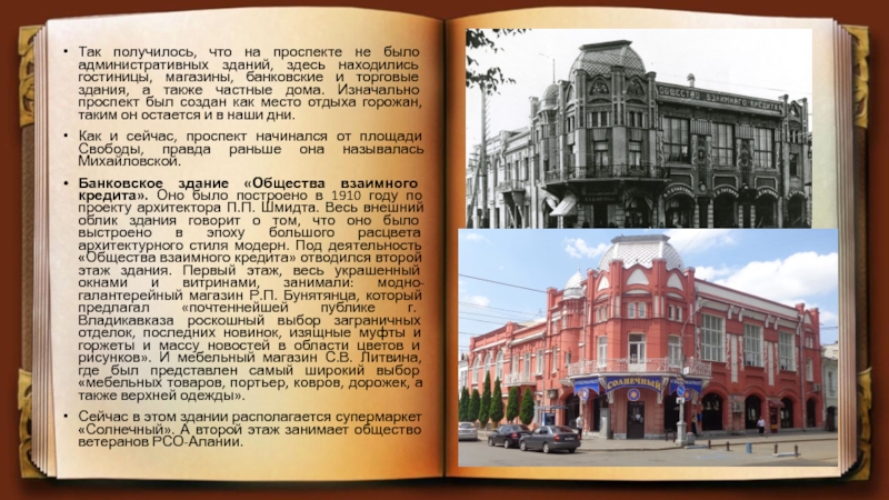 Банковское здание «Общества взаимного кредита». Оно было построено в 1910 году по проекту архитектора П.П. Шмидта. Весь внешний облик здания говорит о том, что оно было выстроено в эпоху большого расцвета архитектурного стиля модерн. Под деятельность «Общества взаимного кредита» отводился второй этаж здания. Первый этаж, весь украшенный окнами и витринами, занимали: модно-галантерейный магазин Р.П. Бунятянца, который предлагал «почтеннейшей публике г. Владикавказа роскошный выбор заграничных отделок, последних новинок, изящные муфты и горжеты и массу новостей в области цветов и рисунков». И мебельный магазин С.В. Литвина, где был представлен самый широкий выбор «мебельных товаров, портьер, ковров, дорожек, а также верхней одежды».