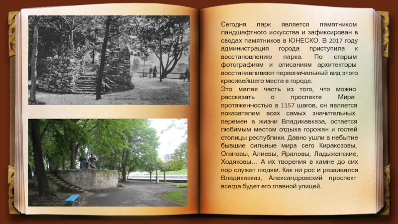 в ЮНЕСКО. В 2017 году администрация города приступила к восстановлению парка. По старым фотографиям и описаниям архитекторы восстанавливают первоначальный вид этого красивейшего места в городе.
