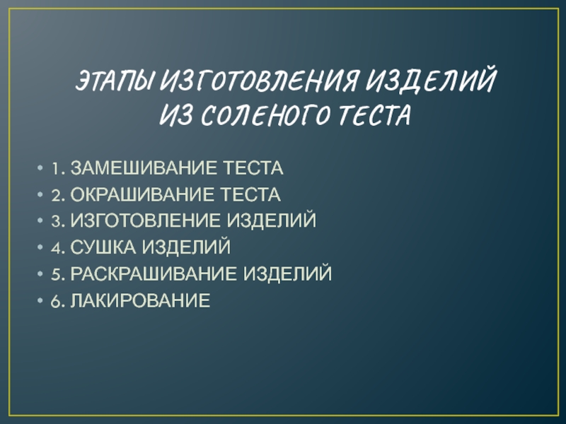 ЭТАПЫ ИЗГОТОВЛЕНИЯ ИЗДЕЛИЙ ИЗ СОЛЕНОГО ТЕСТА 1. ЗАМЕШИВАНИЕ ТЕСТА2. ОКРАШИВАНИЕ ТЕСТА3. ИЗГОТОВЛЕНИЕ ИЗДЕЛИЙ4. СУШКА ИЗДЕЛИЙ5. РАСКРАШИВАНИЕ ИЗДЕЛИЙ6.
