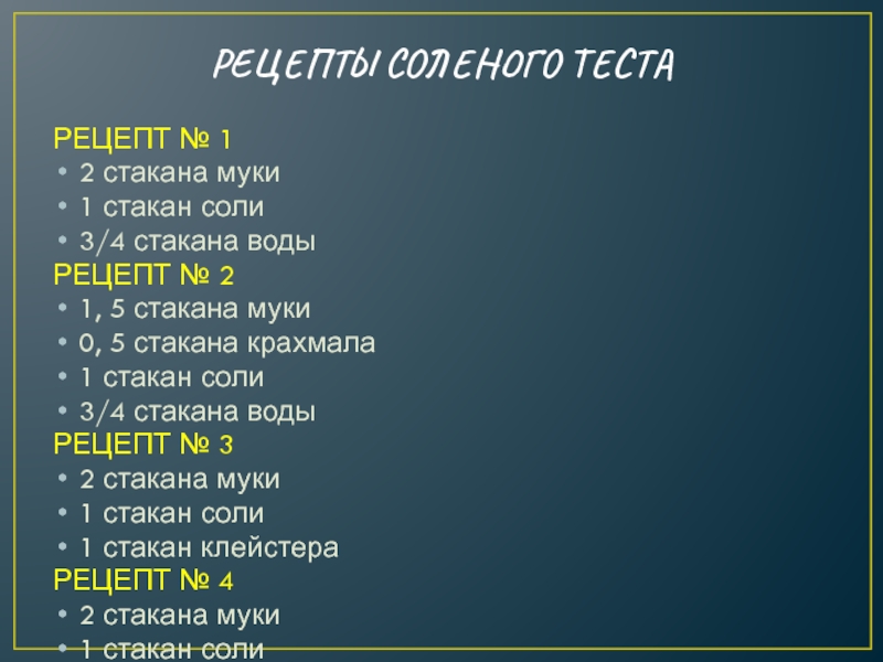 Слайд 4РЕЦЕПТЫ СОЛЕНОГО ТЕСТА