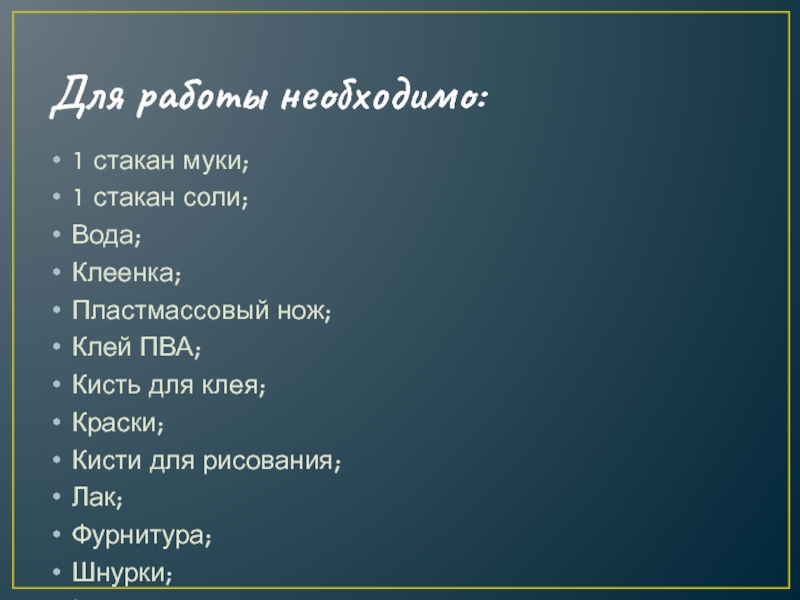 Для работы необходимо:1 стакан муки;1 стакан соли;Вода;Клеенка;Пластмассовый нож;Клей ПВА;Кисть для клея;Краски;Кисти для рисования;Лак;Фурнитура;Шнурки;Крем для рук;Простой карандаш;Лист бумаги.