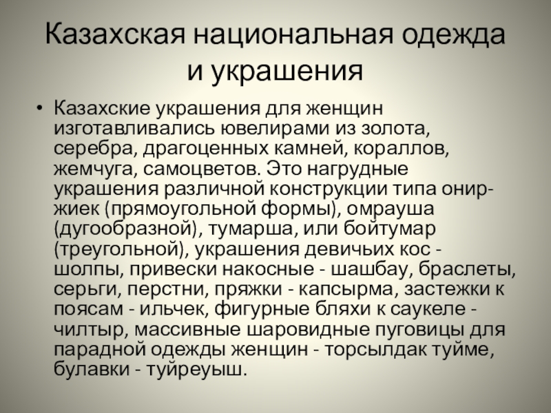 золота, серебра, драгоценных камней, кораллов, жемчуга, самоцветов. Это нагрудные украшения различной конструкции типа онир-жиек (прямоугольной формы), омрауша (дугообразной), тумарша, или бойтумар (треугольной), украшения девичьих кос - шолпы, привески накосные - шашбау, браслеты, серьги, перстни, пряжки - капсырма, застежки к поясам - ильчек, фигурные бляхи к саукеле - чилтыр, массивные шаровидные пуговицы для парадной одежды женщин - торсылдак туйме, булавки - туйреуыш.