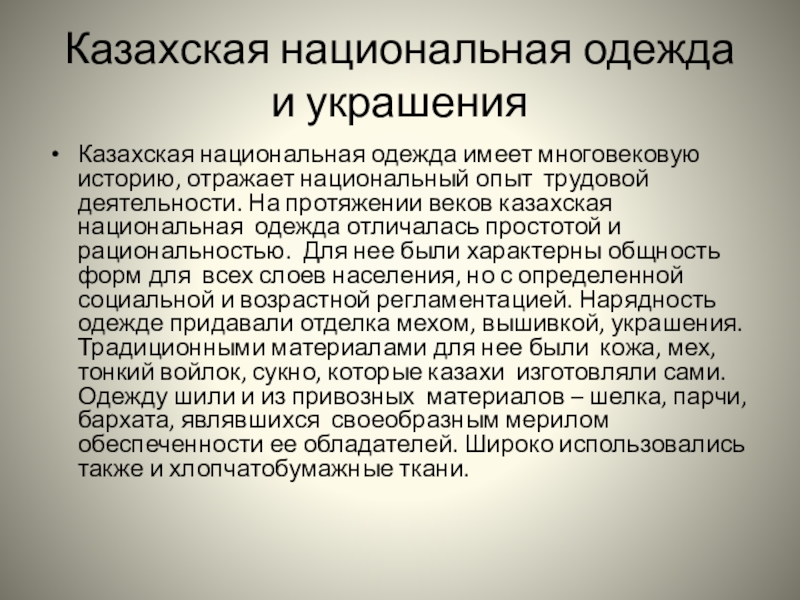 национальный опыт трудовой деятельности. На протяжении веков казахская национальная одежда отличалась простотой и рациональностью. Для нее были характерны общность форм для всех слоев населения, но с определенной социальной и возрастной регламентацией. Нарядность одежде придавали отделка мехом, вышивкой, украшения. Традиционными материалами для нее были кожа, мех, тонкий войлок, сукно, которые казахи изготовляли сами. Одежду шили и из привозных материалов – шелка, парчи, бархата, являвшихся своеобразным мерилом обеспеченности ее обладателей. Широко использовались также и хлопчатобумажные ткани.