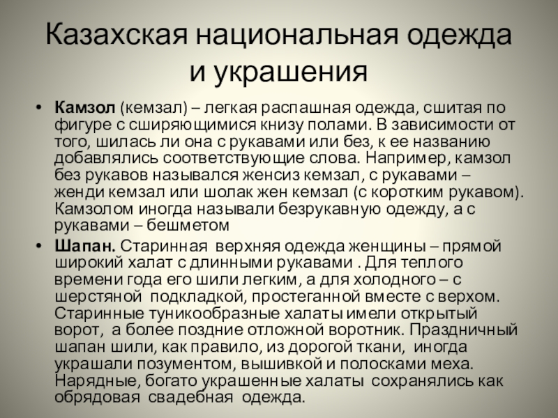 по фигуре с сширяющимися книзу полами. В зависимости от того, шилась ли она с рукавами или без, к ее названию добавлялись соответствующие слова. Например, камзол без рукавов назывался женсиз кемзал, с рукавами – женди кемзал или шолак жен кемзал (с коротким рукавом). Камзолом иногда называли безрукавную одежду, а с рукавами – бешметом