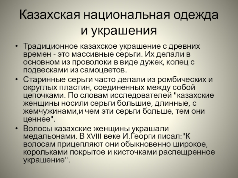 Волосы казахские женщины украшали медальонами. В XVIII веке И.Георги писал:"К волосам прицепляют они обыкновенно широкое, корольками покрытое и кисточками распещренное украшение".