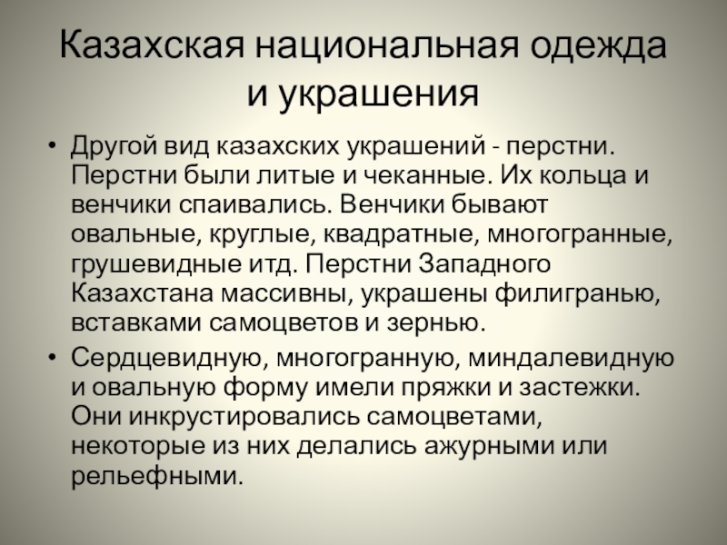 были литые и чеканные. Их кольца и венчики спаивались. Венчики бывают овальные, круглые, квадратные, многогранные, грушевидные итд. Перстни Западного Казахстана массивны, украшены филигранью, вставками самоцветов и зернью.
