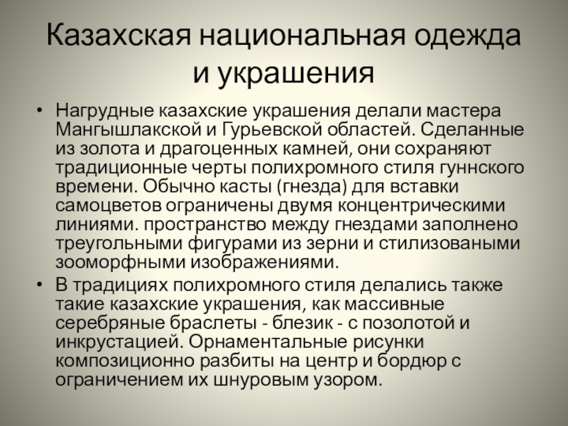 В традициях полихромного стиля делались также такие казахские украшения, как массивные серебряные браслеты - блезик - с позолотой и инкрустацией. Орнаментальные рисунки композиционно разбиты на центр и бордюр с ограничением их шнуровым узором.