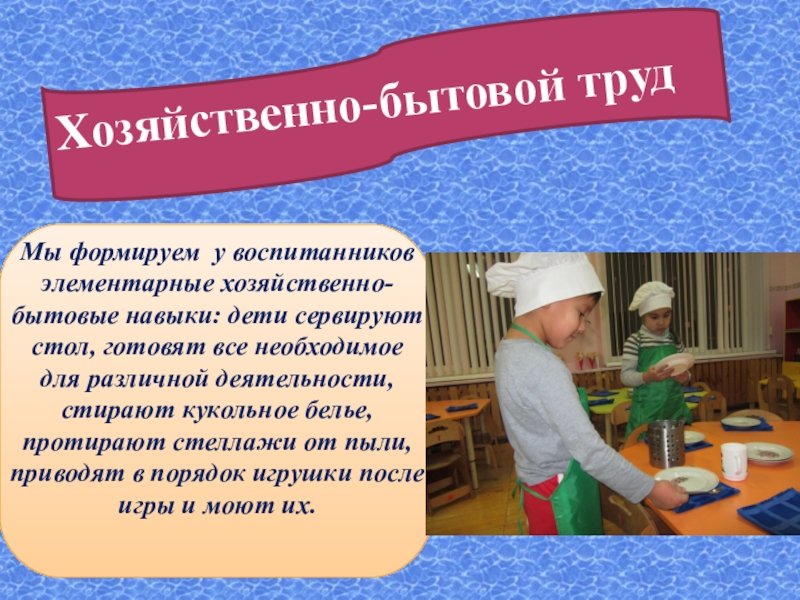 Хозяйственно-бытовой трудМы формируем у воспитанников элементарные хозяйственно-бытовые навыки: дети сервируют стол, готовят все необходимое для различной деятельности,