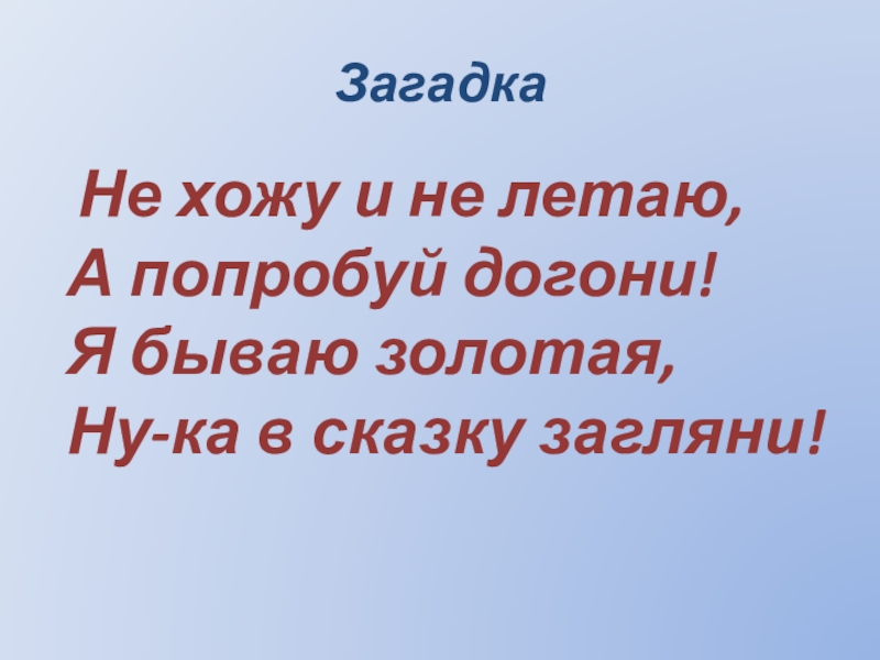 Загадка  Не хожу и не летаю, А попробуй догони! Я бываю золотая, Ну-ка в сказку загляни!