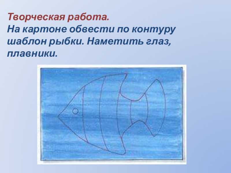 Слайд 4Творческая работа. На картоне обвести по контуру шаблон рыбки. Наметить глаз,