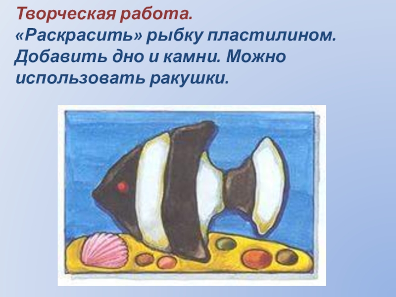 Слайд 5Творческая работа. «Раскрасить» рыбку пластилином. Добавить дно и камни. Можно использовать