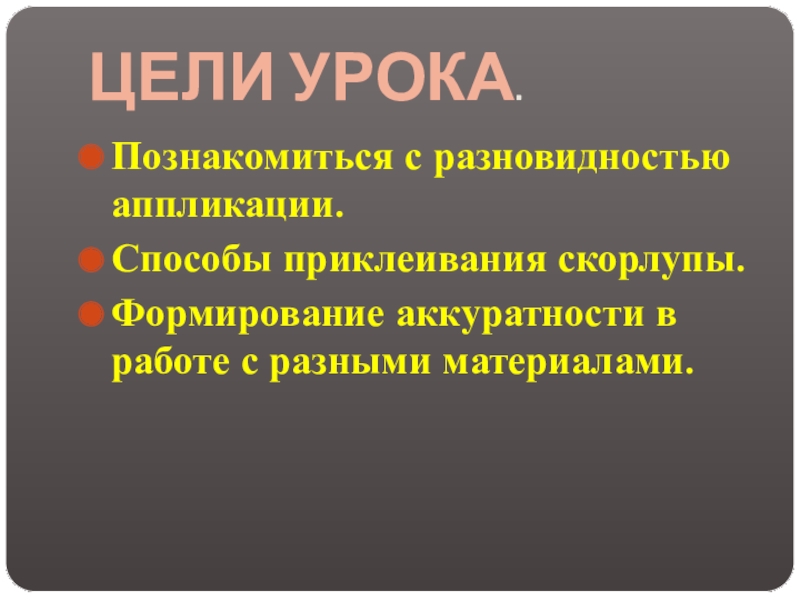 ЦЕЛИ УРОКА.Познакомиться с разновидностью аппликации.Способы приклеивания скорлупы.Формирование аккуратности в работе с разными материалами.