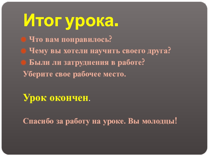 Итог урока.Что вам понравилось?Чему вы хотели научить своего друга?Были ли затруднения в работе?Уберите свое рабочее место.Урок окончен.Спасибо