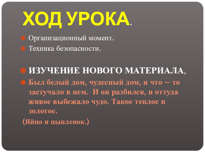 ХОД УРОКА.Организационный момент.Техника безопасности.ИЗУЧЕНИЕ НОВОГО МАТЕРИАЛА,Был белый дом, чудесный дом, и что – то застучало в нем.