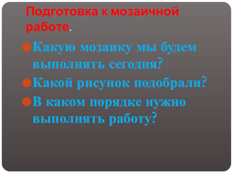Подготовка к мозаичной работе.Какую мозаику мы будем выполнять сегодня?Какой рисунок подобрали?В каком порядке нужно выполнять работу?