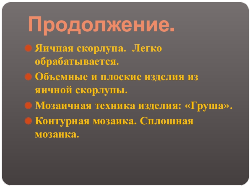 Продолжение.Яичная скорлупа. Легко обрабатывается.Объемные и плоские изделия из яичной скорлупы.Мозаичная техника изделия: «Груша».Контурная мозаика. Сплошная мозаика.