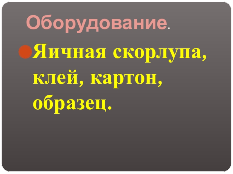 Оборудование.Яичная скорлупа, клей, картон, образец.