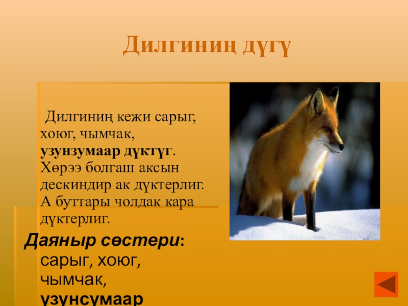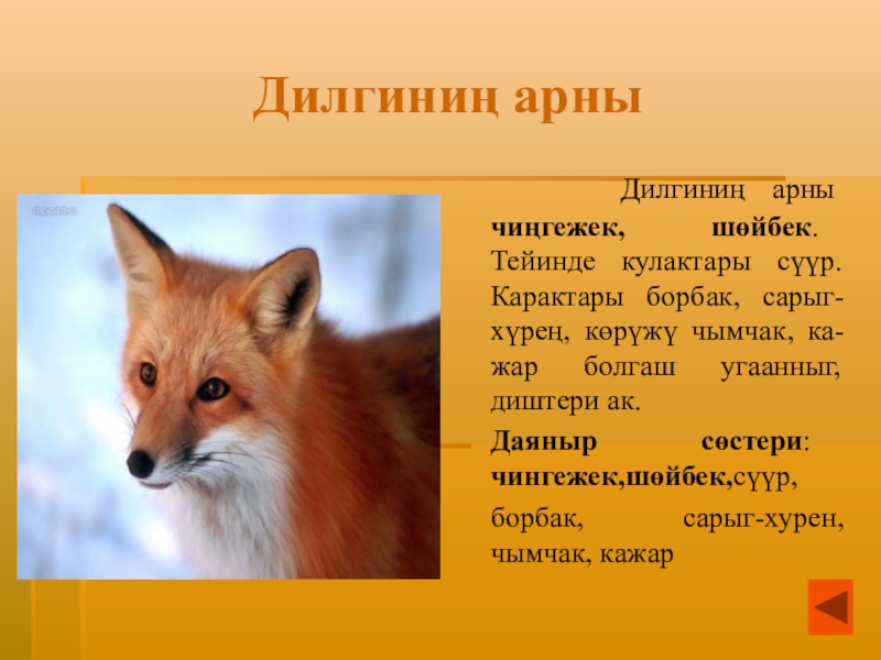 Дилгиниң арны  Дилгиниң арны чиңгежек, шөйбек. Тейинде кулактары сүүр. Карактары борбак, сарыг-хүрең, көрүжү чымчак, ка- жар