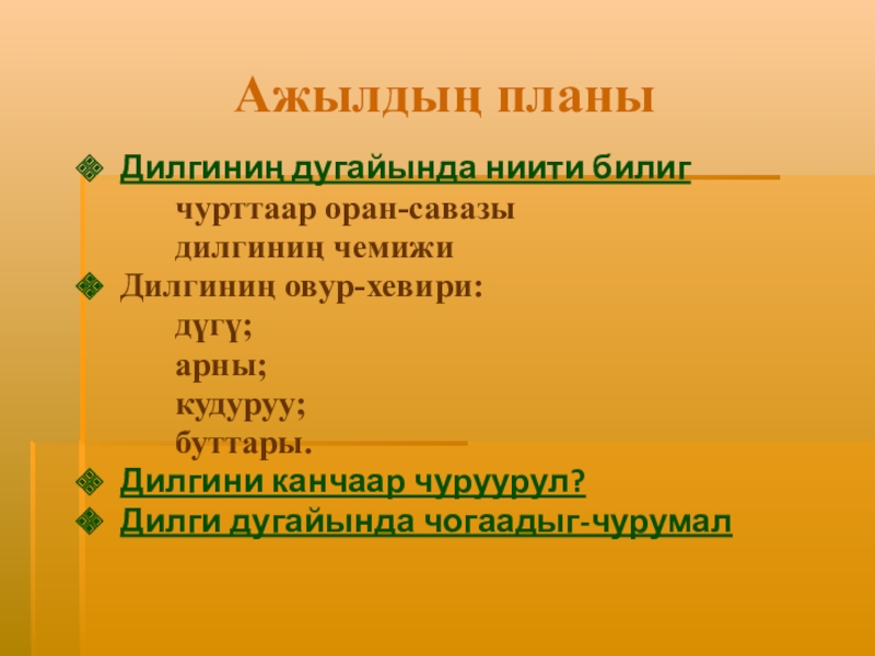 Ажылдың планыДилгиниң дугайында ниити билиг чурттаар оран-савазы дилгиниң чемижиДилгиниң овур-хевири: дүгү; арны; кудуруу; буттары. Дилгини канчаар чуруурул?Дилги дугайында чогаадыг-чурумал