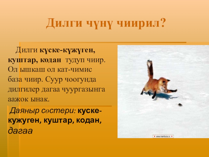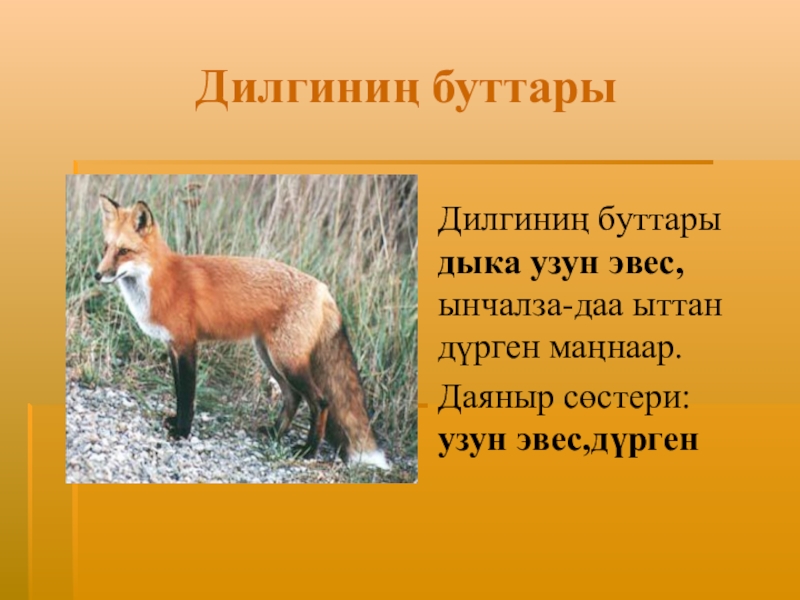 Дилгиниң буттарыДилгиниң буттары дыка узун эвес, ынчалза-даа ыттан дүрген маңнаар. Даяныр сөстери: узун эвес,дүрген