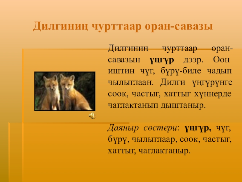 Даяныр сөстери: үңгүр, чүг, бүрү, чылыглаар, соок, частыг, хаттыг, чаглактаныр.