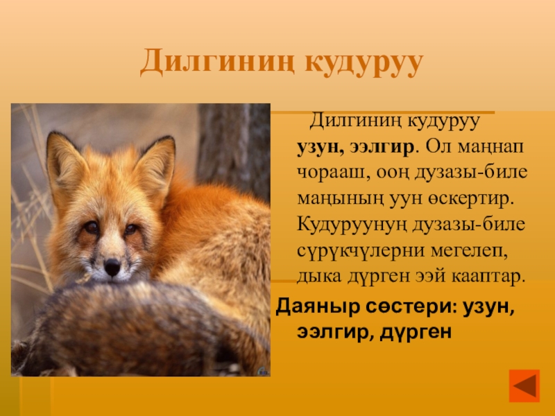 Дилгиниң кудуруу    Дилгиниң кудуруу узун, ээлгир. Ол маңнап чорааш, ооң дузазы-биле маңының уун өскертир.