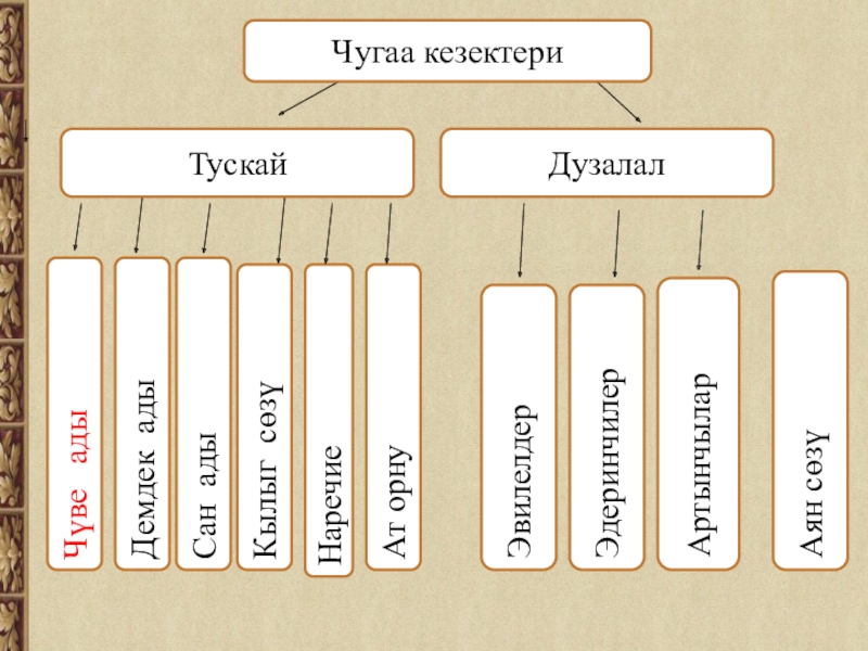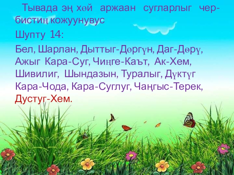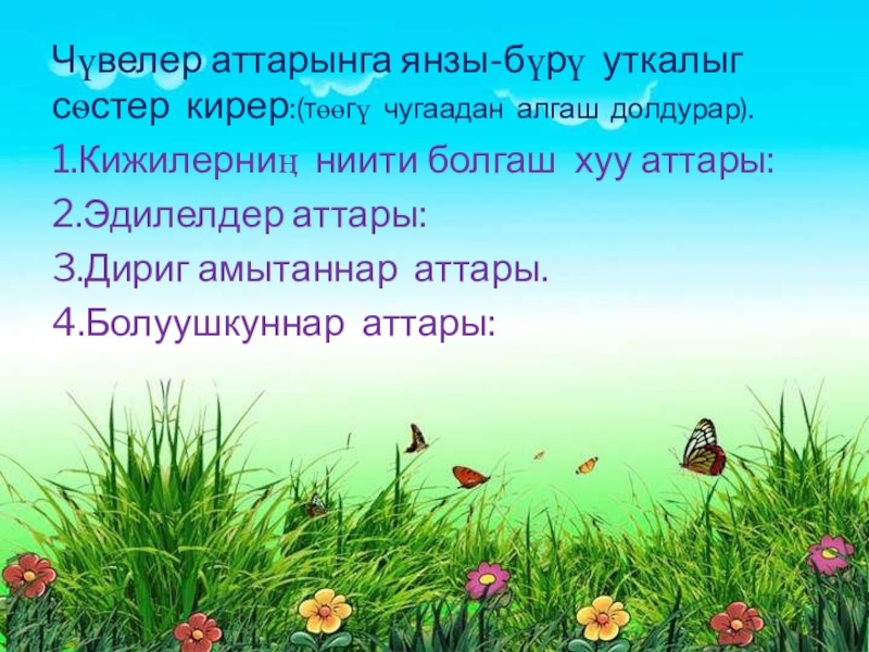Слайд 21Чүвелер аттарынга янзы-бүрү уткалыг сѳстер кирер:(төөгү чугаадан алгаш долдурар).