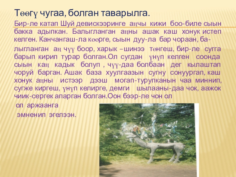боо-биле сыын бакка адыпкан. Балыгланган аӊны ашак каш хонук истеп келген. Канчангаш-ла көөрге, сыын дуу-ла бар чораан, ба-