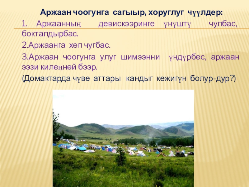 Слайд 22Аржаан чоогунга сагыыр, хоруглуг чүүлдер: