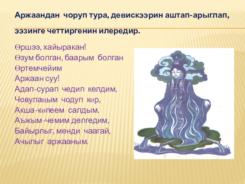Слайд 23Аржаандан чоруп тура, девискээрин аштап-арыглап, ээзинге четтиргенин илередир.