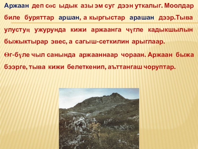 Слайд 4Аржаан деп сөс ыдык азы эм суг дээн уткалыг. Моолдар биле