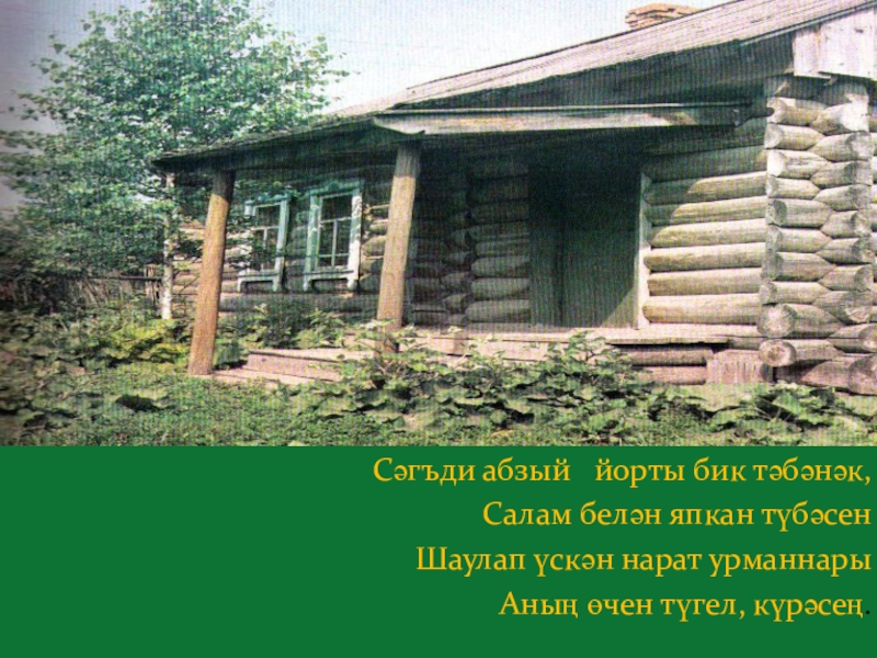 Сәгъди абзый  йорты бик тәбәнәк,Салам белән япкан түбәсенШаулап үскән нарат урманнары Аның өчен түгел, күрәсең.