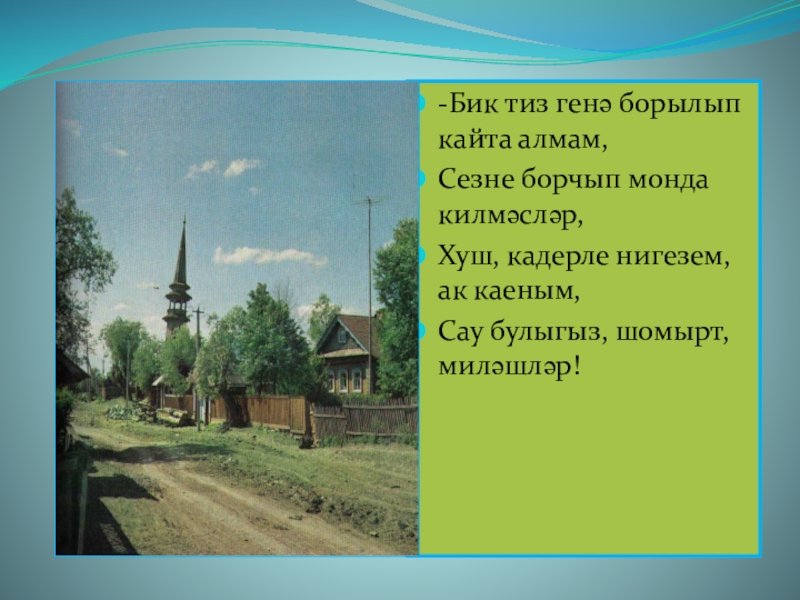 -Бик тиз генә борылып кайта алмам,Сезне борчып монда килмәсләр,Хуш, кадерле нигезем, ак каеным, Cау булыгыз, шомырт, миләшләр!