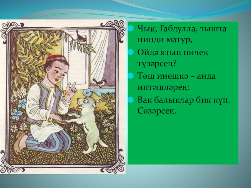 Чык, Габдулла, тышта нинди матур,Өйдә ятып ничек түзәрсең?Төш инешкә – анда иптәшләрең:Вак балыклар бик күп. Сөзәрсең.