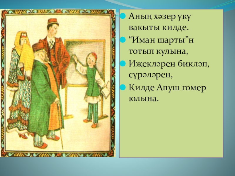 Аның хәзер уку вакыты килде.“Иман шарты”н тотып кулына,Иҗекләрен бикләп, сүрәләрен, Килде Апуш гомер юлына.